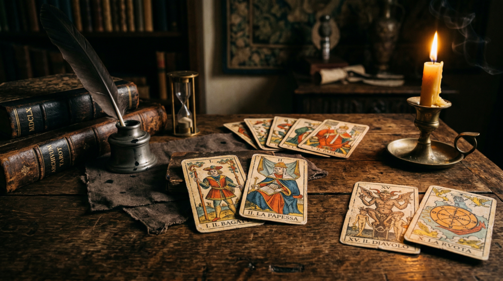 タロットカードというと「占いの道具」という印象が強いかもしれません。ですが、タロットの歴史をたどると、もともとは1300年~1400年代のイタリアで生まれたカードゲームであり、最初から占いのために作られたわけではないことがわかります。現在では、占い・自己探求・アートなど幅広い用途で親しまれており、オリジナルデッキを制作する動きも広がっています。この記事では、タロットの起源、占いに使われるようになった背景、代表的なデッキの系譜、そして現代のオリジナル制作につながる視点まで、わかりやすく整理して解説します。